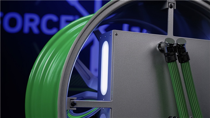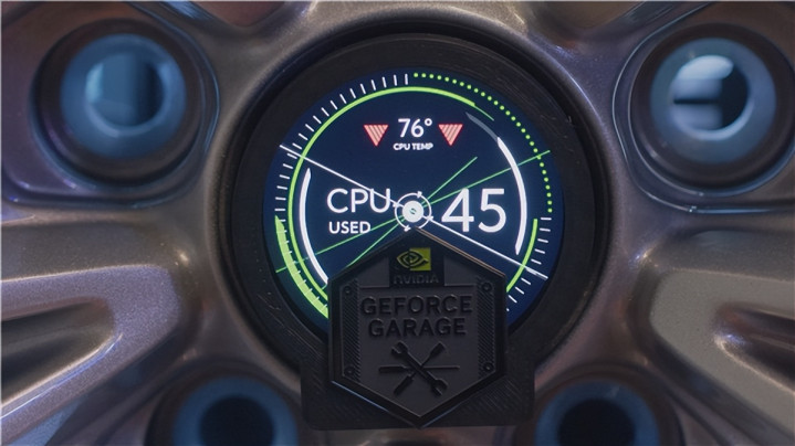 冷却系统不仅为电脑散热,还充当了轮毂的展示架,从功能到美学上都与轮毂相得益彰,轮毂中心的盖子被升级为一个显示屏,旁边还有一个小的GeForce Garage徽章。